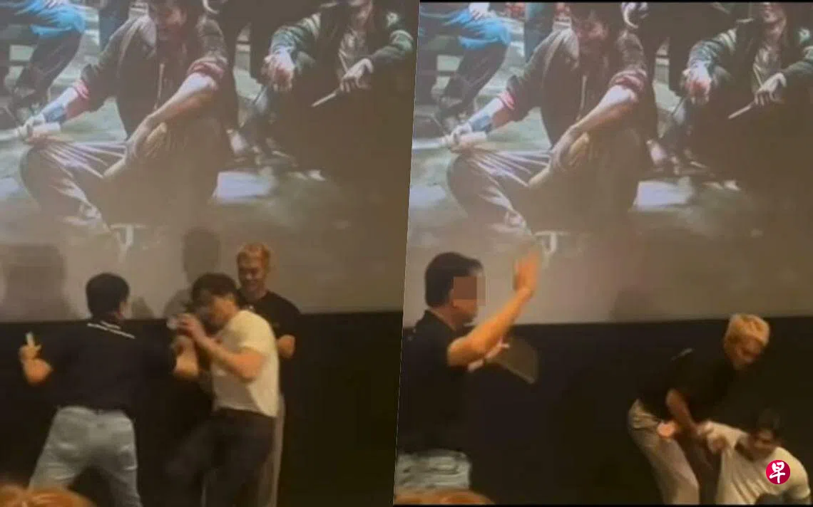 中年男被伍允龙出招震退后,伸手向演员示意握手,结果下秒却突然肘击伍允龙胸部,令对方再度往后倒,当时站在一旁的男星胡子彤急忙搀扶,场内观众惊声尖叫,林峯赶紧上前缓颊,劝告该大叔“别冲动”。