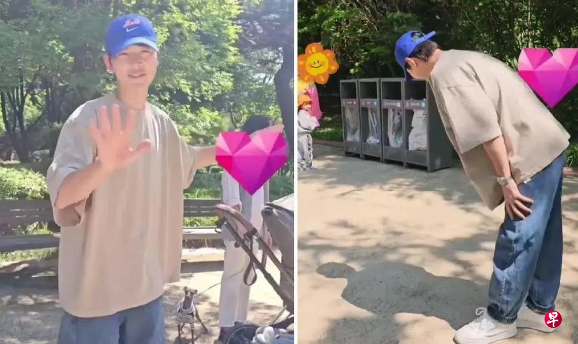 宋仲基与老婆推着婴儿车,带11个月大儿子逛公园,被粉丝认出,他鞠躬致意。 (互联网)