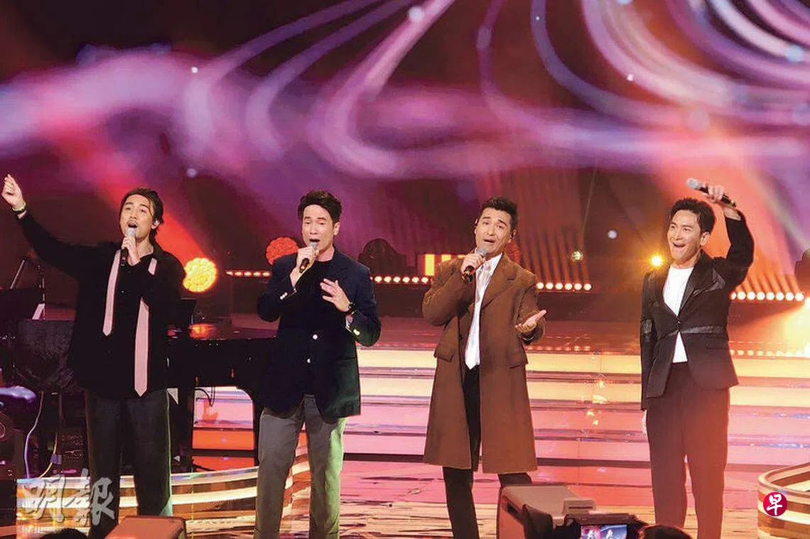 (香港讯)TVB(无线)视帝陈豪、陈展鹏、谭俊彦及马国明6月1日晚上为无线筹款节目《万众同心公益金》表演,陈展鹏独唱电视剧《逆天奇案2》插曲《后悔万年》,之后与陈豪、谭俊彦和马国明合唱李克勤的《红日》。陈展鹏与谭俊彦唱得最投入,被封“唱歌担当”,不时放下麦克风挥手的马国明自嘲是“和唱担当”,陈豪则被其他三人捧为“颜值担当”。