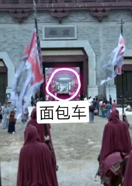 二、背景出现面包车。原本只是百姓日常生活背景影像的一场戏,结果被网民抓包,在人来人往的古城门外,竟然出现一辆现代面包车,让观众觉得啼笑皆非。