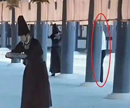 六、宫廷现身穿白T恤黑裤男子。宫廷中的一场景戏,乍看井然有序的宫人中,柱子后方竟躲着一名身穿白色T恤黑色裤子的男子,露出背部和臀部的身影看起来令人爆笑。
