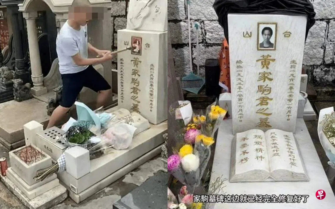 (香港讯)香港乐队Beyond已故主唱黄家驹的墓碑,5月底遭光头男以铁锤重击墓照和向墓碑泼汽水恶意破坏。两名分别15岁和23岁的男子被控一项刑事毁坏罪。事隔两周,黄家驹的墓碑完成修复。歌迷前往将军澳华人永远坟场拜祭时发现,黄家驹的墓碑照弃用原本脸露微笑的彩色相,换上另一张黑白照。