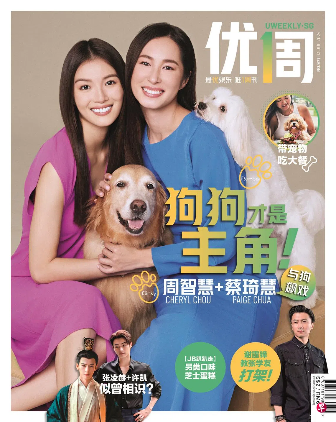 (本地讯)第971期《优1周》已出街,本期封面人物是本地宠物题材爱情剧《宠他,还是爱我?》的演员周智慧和蔡琦慧,再加两只“狗演员”Binky和Rambo!当爱狗的周智慧和怕狗的蔡琦慧,在剧里上演典型“人狗情未了”戏码,前者觉得这个角色是上天狗狗送给自己的礼物,后者则因为与狗狗的长时间相处,成功克服怕狗的恐惧。