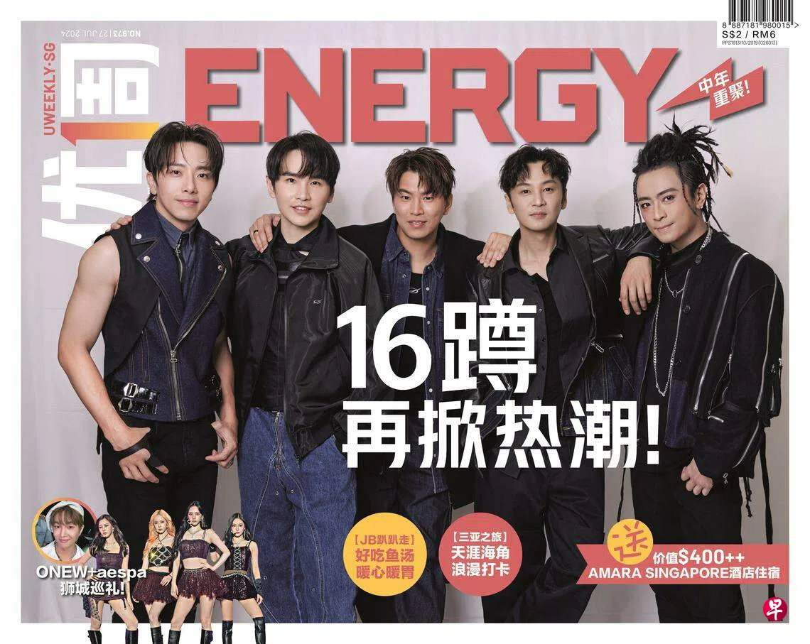 (本地讯)第973期《优1周》已出街,封面人物是7月27日和28日在台北小巨蛋热烈开唱的男团Energy!解散近20年,台湾“最杀唱跳男团”Energy重新合体,强势回归乐坛。五名成员牛奶(44岁)、阿弟(42岁)、书伟(43岁)、坤达(42岁)和Toro(42岁),从蹦跳少年蜕变为花样熟男,年龄都超过40,依然状态在线。