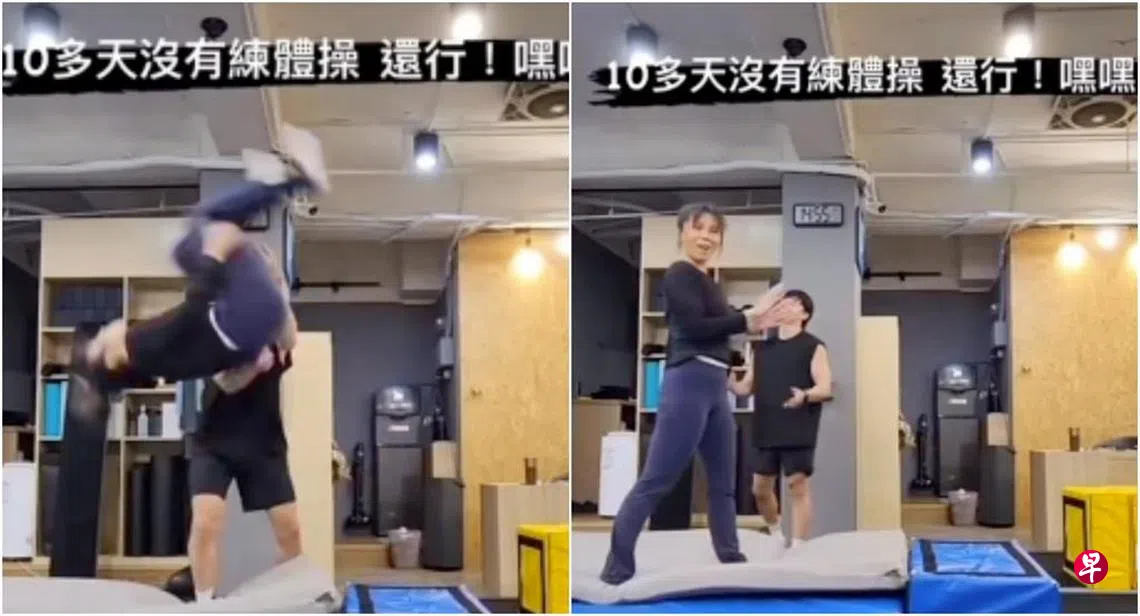 近日一段她腾空旋转后翻的片段在网络流传,画面可见蔡健雅将一头长鬈发随意盘起,身穿淡紫色运动上衣,下身则搭配紧身瑜伽裤。只见她将双手先横向平举,接着微微屈膝蓄力,收紧核心后向上跃起,紧接着双脚腾空向后翻转!在专业辅助绳的保护下,她整个人在半空中旋转180度后,完美落地。整套动作一气呵成,宛如经过专业训练的体操运动员。