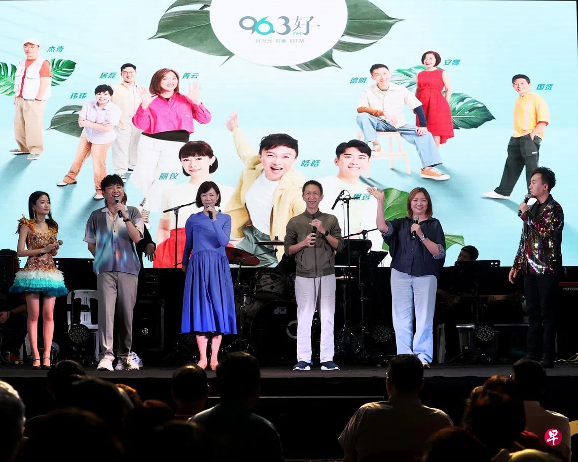 他们先是介绍电台的节目和阵容,随后就开始高唱耳熟能详的“爱拼才会赢”,不少观众纷纷兴起合唱。他们也不断向观众席派发小礼品,欢乐气氛洋溢全场。