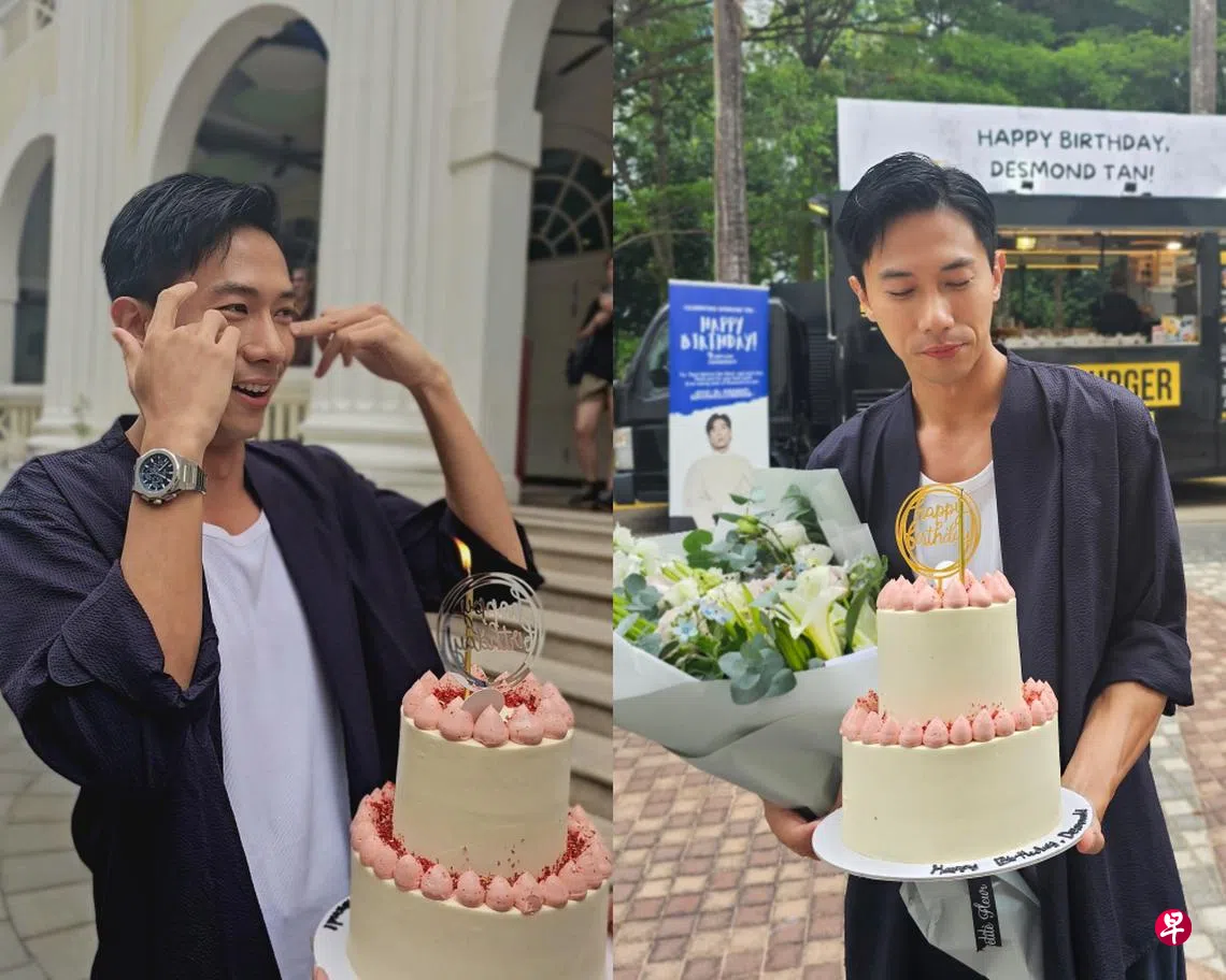 新加坡艺人陈泂江8月19日过38岁生日,正在拍摄《庭外的一角》的他今天休息一天无须开工。他的粉丝会“Destanation”提前在17日为他炮制惊喜,让他感动得眼睛湿湿的。
