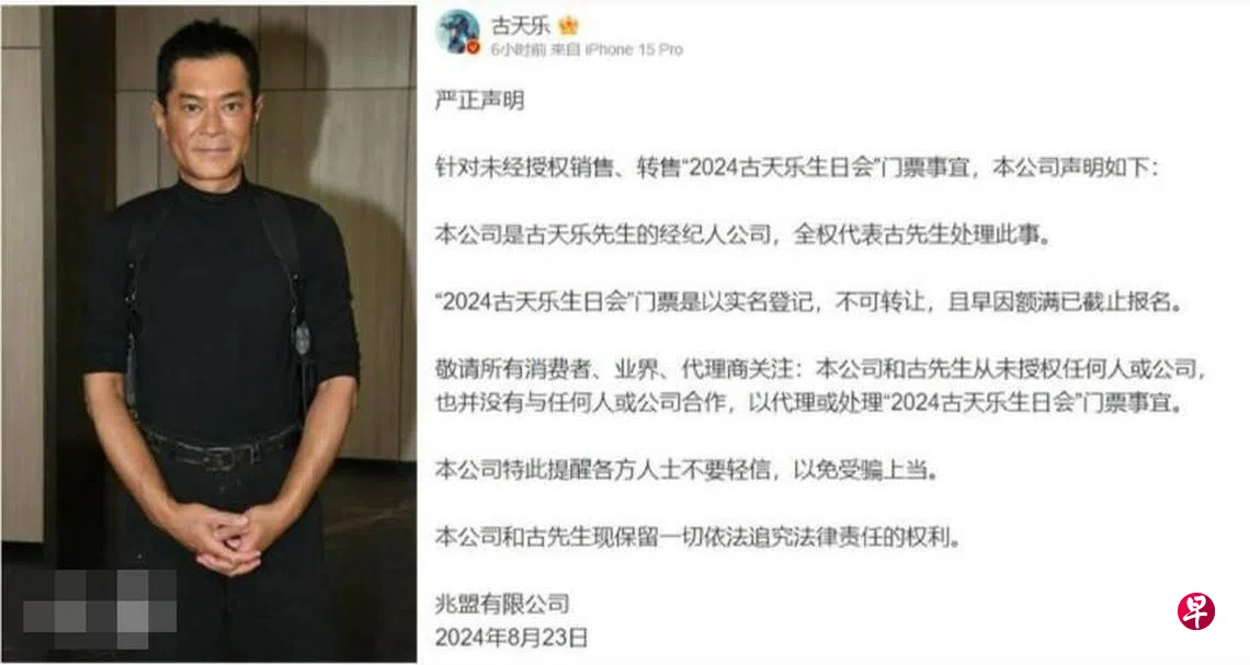 对此,古天乐方面透过社交网发出严正声明,澄清门票以实名登记,不可转让,而且早因额满而截止报名,并提醒各方人士不要轻信,并保留法律追究权利。