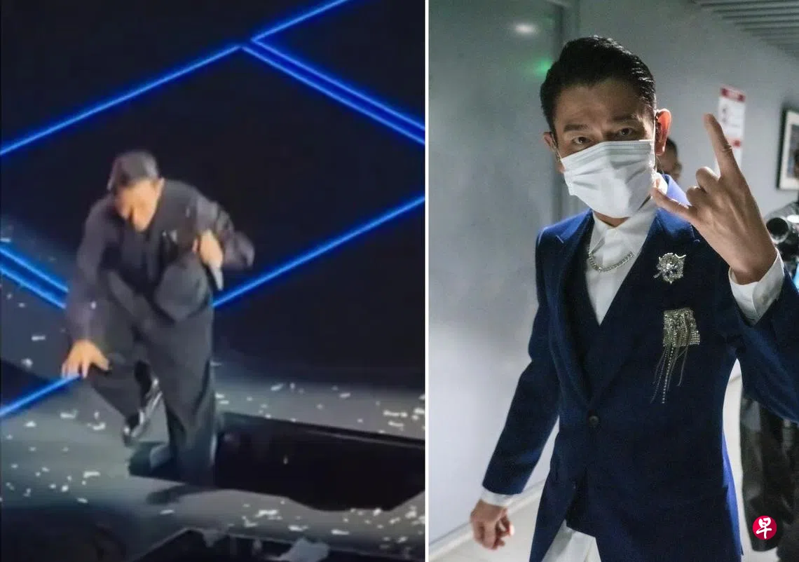 刘德华在台上和歌迷互动唱着《男人哭吧不是罪》时,舞台的地下通道门不慎打开,冒出“大洞”。但他没注意到,整个人踩空,下半身掉进洞里,幸好他反应快及时撑住,没有掉下去。