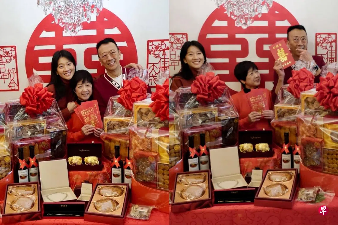 郑瑶2月1日大年初四在Instagram(IG)贴出过大礼的照片,发文“蛇年家有囍事! #过大礼”。照片中,郑瑶与父母穿上红彤彤的服饰,桌上摆满包括洋酒及名贵的山珍海味等礼品。其中,一对金光闪闪的超大龙凤手镯最吸引眼球。