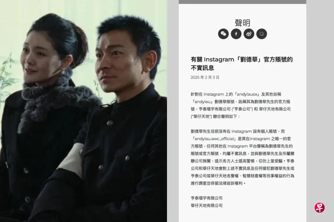亨泰环宇有限公司和华仔天地有限公司联合声明称:“刘德华先生目前IG没有设个人账号,而andylau.awc_official是其在IG之唯一的官方账号。任何其在IG平台声称为刘德华先生的账号,以及所属关联公司都和我们无关,提示各方人士提高警惕,切勿上当受骗。”