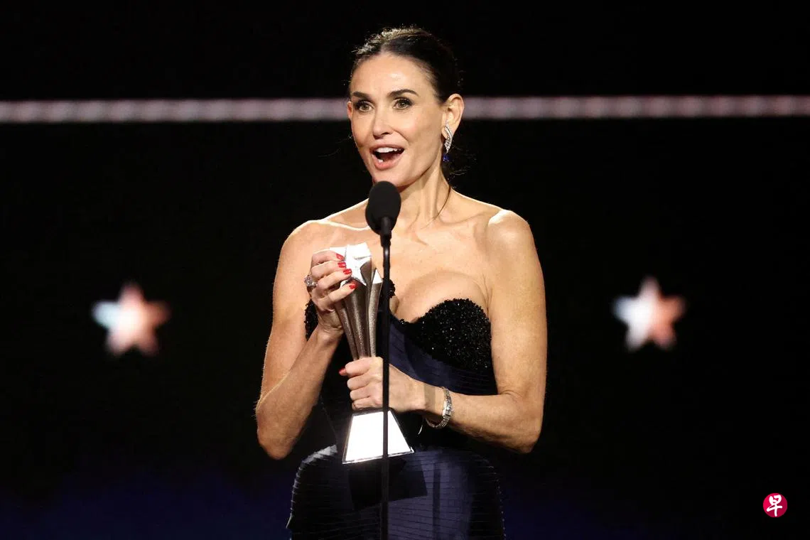 (外讯)第30届美国评论家选择奖颁奖礼在当地时间2月7日举行,62岁影星Demi Moore(狄美摩亚)凭借《完美物质》(The Substance)继金球奖后再度拿下最佳女主角。新科影后喜上眉梢,说:“获得肯定就像是一帖仙丹灵药,我要鼓励那些还在努力或是寻找方向的人们,现在还没实现,不代表不会实现,梦想总会成真。”