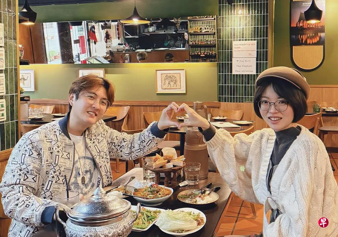 在台湾的黄靖伦晒出跟老婆在泰国料理餐馆用餐,夫妻俩比爱心手势的合照。他的IG发文走“土味情话”路线,写道:“情人节为什么选择吃泰式呢?因为“泰”(太)爱你了呀!”这个示爱梗不错,男士们可学起来。