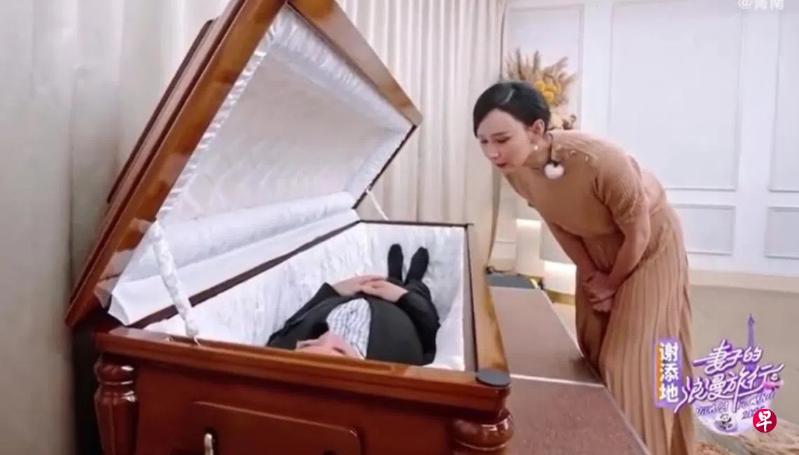 在预告片中,中国女星胡静与马来西亚富商老公朱兆祥玩了一个名为“死亡练习”的游戏。朱兆祥神态自若地躺进一具木棺中,双眼紧闭,仿若已然离世之人。胡静则正读着丈夫写给她的最后一封信,“亲爱的宝贝大王,我先下车了……”读到此处,她已沉浸于角色中,泪如雨下说:“老公,快出来呀,怎么搞得跟真的似的。”朱兆祥安慰胡静:“那(棺木)还没关起来。”胡静又伤心又生气回说:“我不要(棺木)关起来!”