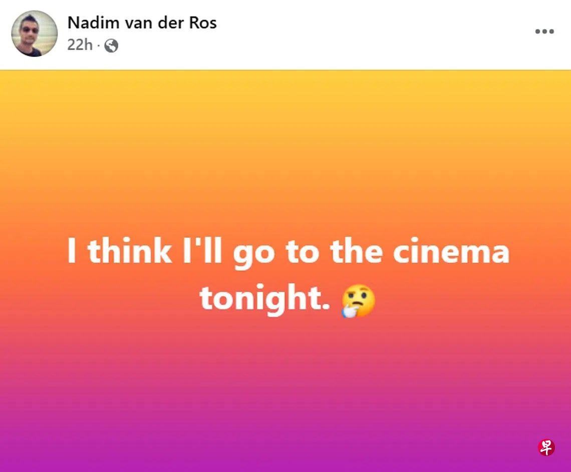孙燕姿5日举行的首场25周年演唱会让歌迷翘首期盼,纳迪姆却在同一天下午1时17分通过脸书发文幽老婆一默,写道:“I think I’ll go to the cinema tonight.(我想我今晚会去戏院。)”