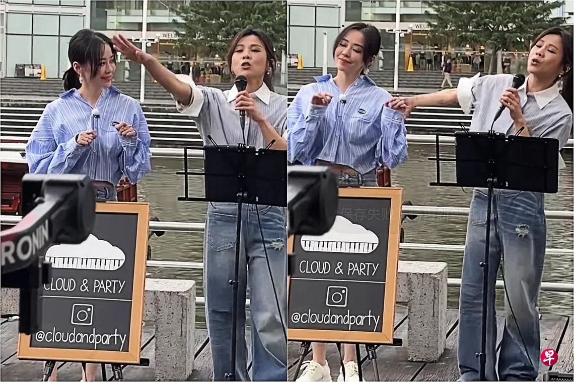 有网民星期二(8日)在社媒分享蔡健雅和张靓颖在克拉码头街头高歌的视频,只见张靓颖献唱《终于等到你》,在唱最后一句“终于等到你”之前还即兴加了一句“Singapore”;紧接着是蔡健雅陶醉演唱“Beautiful Love”的片段。