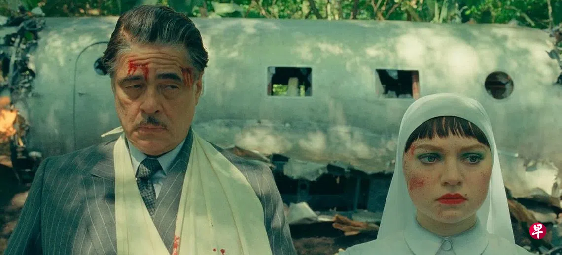 最新作品《腓尼基计划》(The Phoenician Scheme),评价注定两极。把故事背景设定在1950年代,名正言顺继续玩复古美感。用谍战作为包装,写一段父女情仇,与此同时宏观嘲讽寡头政治。似乎有些不同于导演过往作品里的纯真与哀愁,开场飞机失事时骤然上演的一幕残暴血腥,已超越对安德逊的预设。不过,掉落玉米田的Benicio del Toro(贝尼西奥迪托路)啃着玉米捧着肠子,公告天下自己第六度坠机死里逃生,犹如九命怪猫的人物设定,却又十分安德逊。