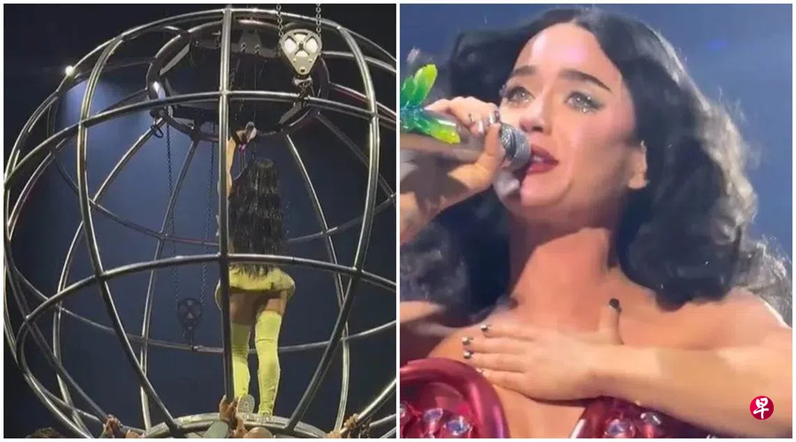 Perry日前在澳大利亚阿德雷德(Adelaide)举办巡演,演唱会高潮段落,她搭乘巨型金属球体升上半空,却突然机关故障,金属球剧烈倾斜,她被迫死命抓紧内部支架,惊险悬挂在半空中。现场音乐立刻中断,工作人员火速上台抢救,观众惊呼声四起,场面一度失控。所幸最后安全脱困,她坚强地继续完成演出。