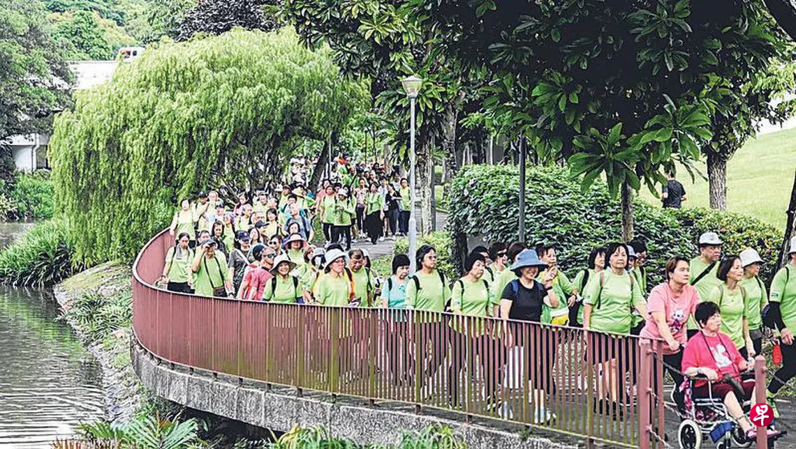 “趴趴走”团队早上约9时出发,花了近一小时走了4.5公里。出发前部长在台上和大家一起热身,活力满满,随后边走边热情地与民众打招呼、合照。
