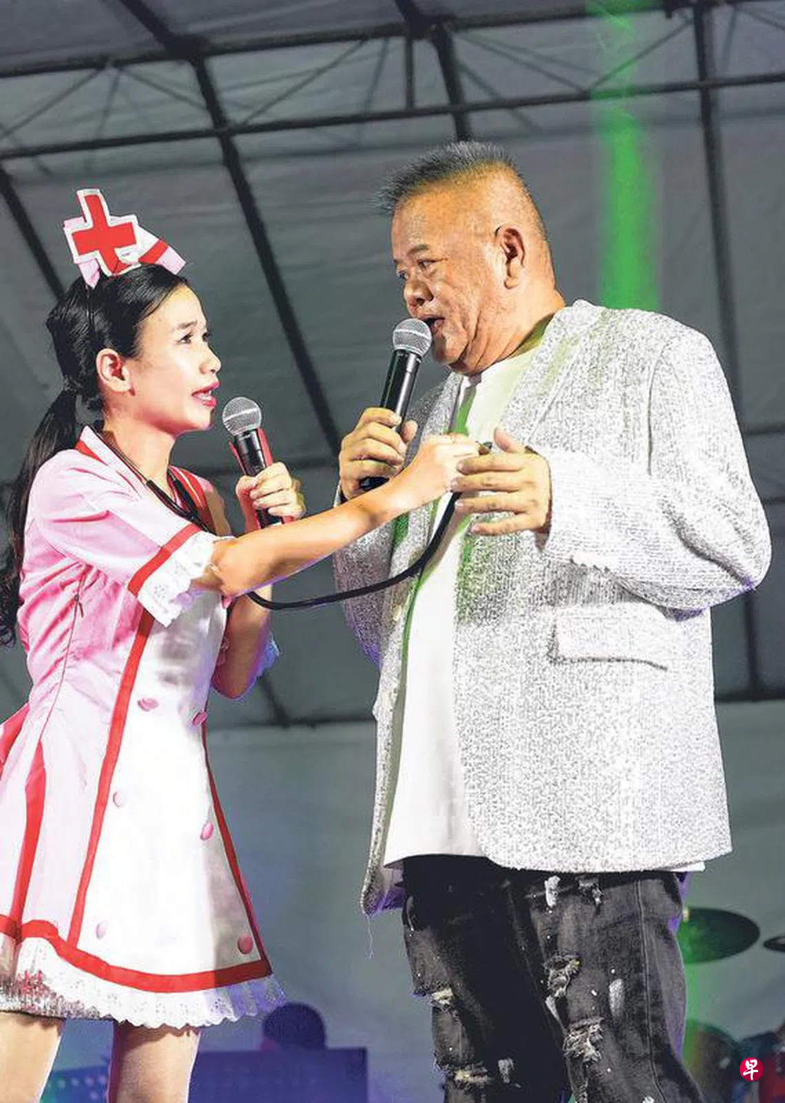 庄清玉唱完第一首歌后,李佩芬穿着红白俏丽的护士服出场,她一脸严肃地调整听诊器后说听不见庄清玉的心跳声。