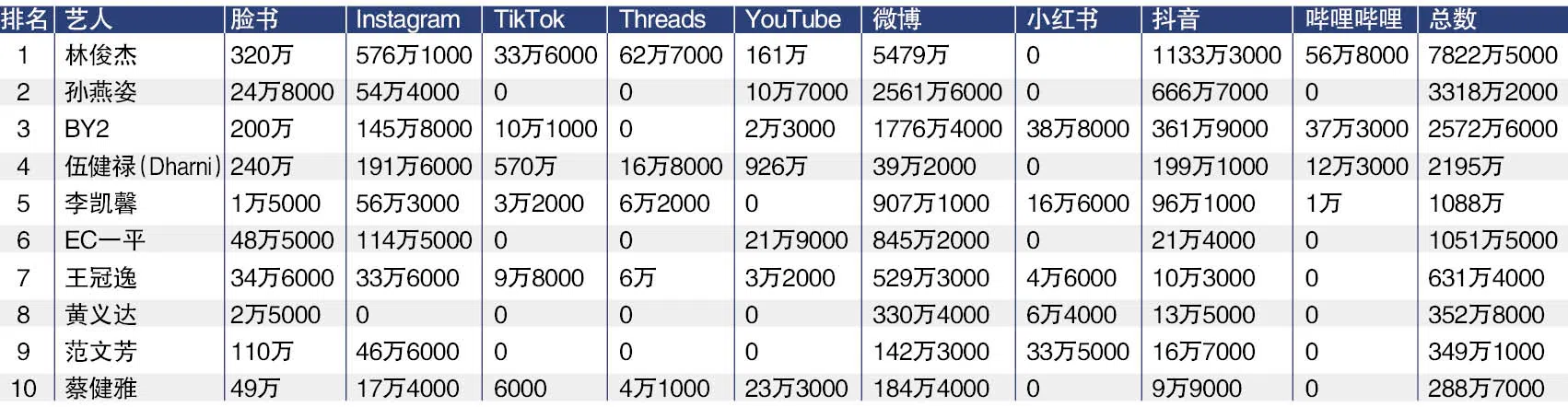 先说说社交媒体。脸书、Instagram(IG)、TikTok、微博、YouTube问世多年,大家并不陌生。小红书有“中国改良版IG”的称号;Threads账号与IG连通,是类似“X”(原推特)的平台;哔哩哔哩则是中国弹幕视频分享网站。记者发现,大部分艺人的X账号已经停更,因此不把该平台纳入统计范围。另外,粉丝数少于1000的数据也不纳入计算。