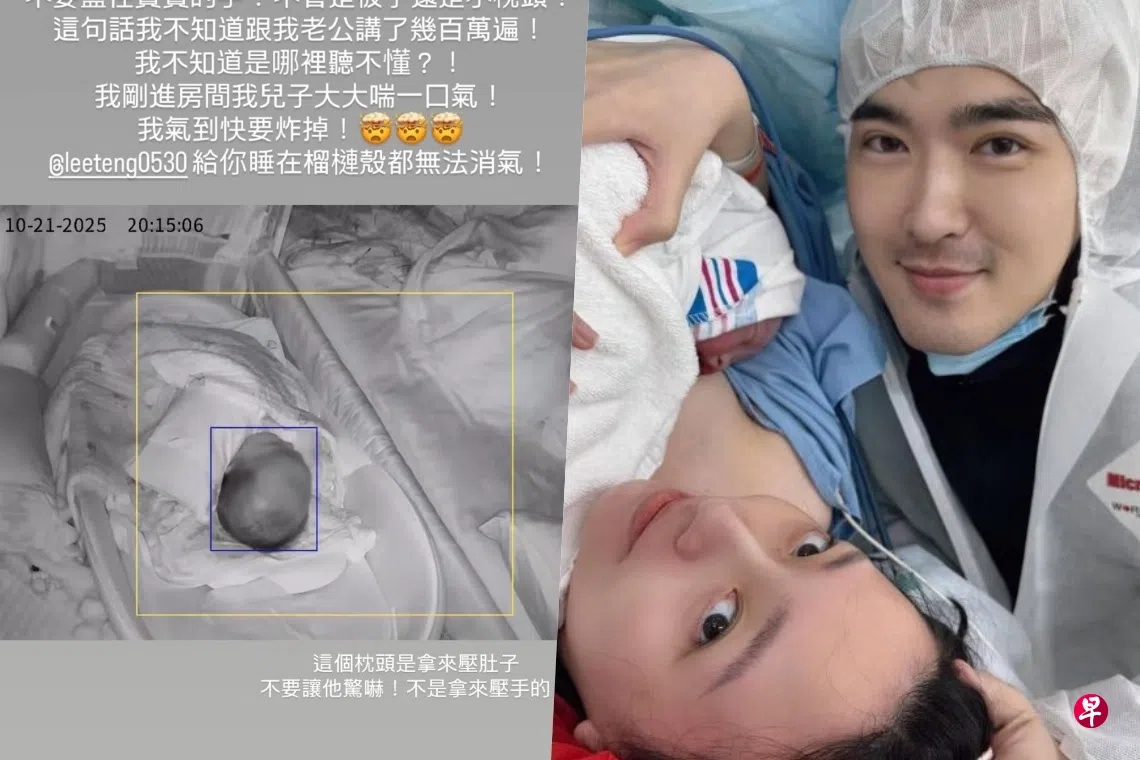 新加坡艺人李腾今年7月喜迎儿子Ellison,和妻子Gina升级爸妈,近来也常在社媒分享育儿片段。不过Gina 21日在Instagram的限时动态中“控诉”老公哄睡宝宝的方式太危险,让她“气到快要炸掉”。