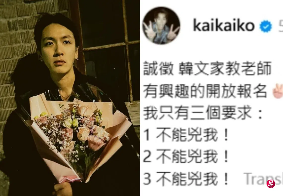 柯震东在贴文中开门见山地写道“诚征韩文家教老师”,并搭配两个比着Yeah的手势符号,“有兴趣的开放报名”。这则突如其来的征人消息,显示出他近期有意精进语言能力,希望能找到合适的对象来指导韩文。