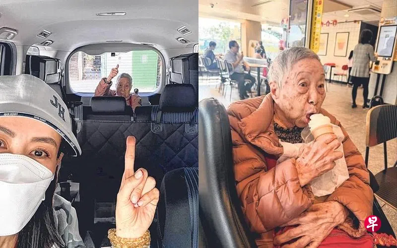 照片可见,宣萱驾着车,英姐坐在后座竖起大拇指与宣萱合照,宣萱又带老人家吃冰淇淋,当英姐亲生妈妈疼爱。