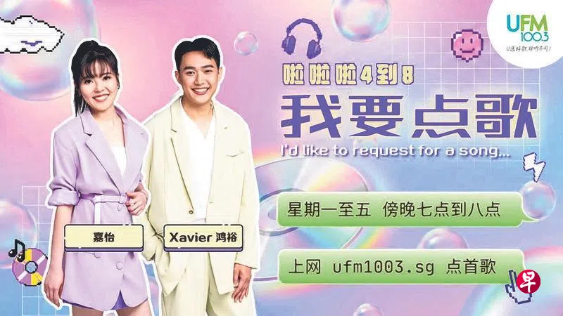 电台UFM 100.3今年10月欢庆25周年,即日起推出一系列的精彩单元,包括重现上世纪八九十年代广受欢迎点歌节目氛围的单元《我要点歌》,由新一代DJ沈嘉怡和马鸿裕挑大梁,对两个90后的DJ而言,点歌节目既陌生又熟悉,两人皆表明最大的挑战是要找回当年点歌节目的味道,同时也要树立自己的特色。