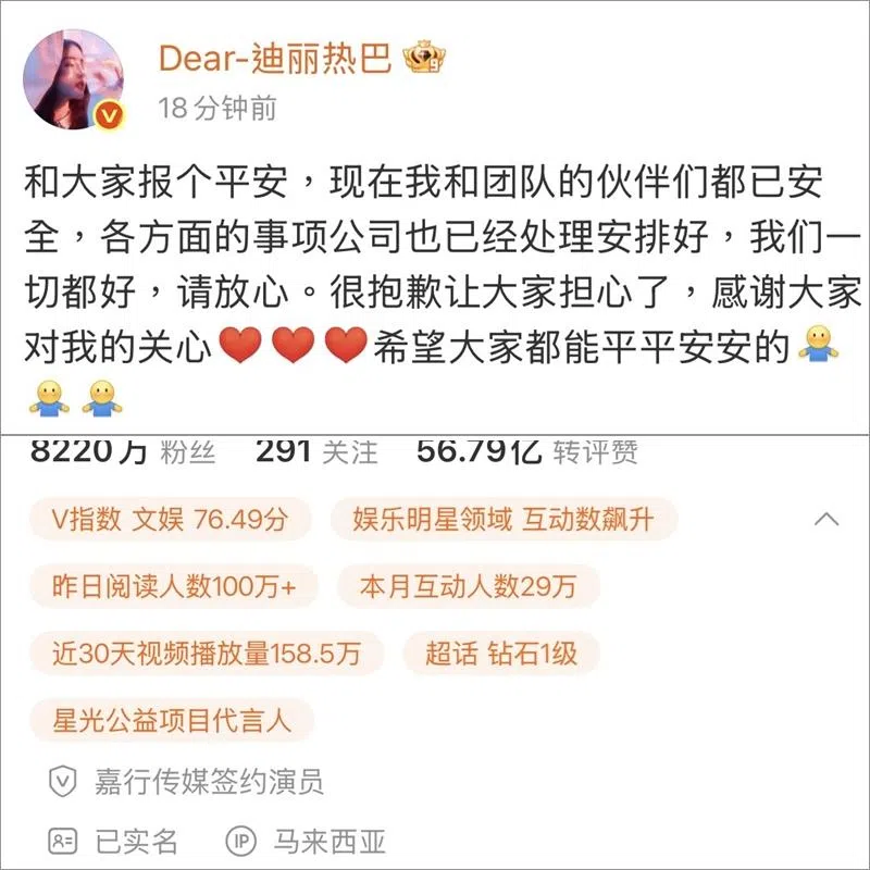 【更新】迪丽热巴在4日晚上8时20分在微博报平安,她写道:“和大家报个平安,现在我和团队的伙伴们都已安全,各方面的事项公司也已经处理安排好,我们一切都好,请放心。很抱歉让大家担心了,感谢大家对我的关心希望大家都能平平安安的。”而迪丽热巴的微博IP属地为马来西亚。