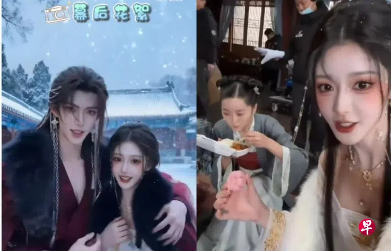 “大家好!我刚拍完吃饭的戏!”接着蹲下拍摄一旁吃饭的伙伴,笑称:“这是剧里吃剩菜的!”随后,她走向户外介绍男主角:“好冷好冷!这是我们的大帅哥!等会儿要去拍雪里的戏。”男主角也亲切叮咛:“冬天要注意保暖!”