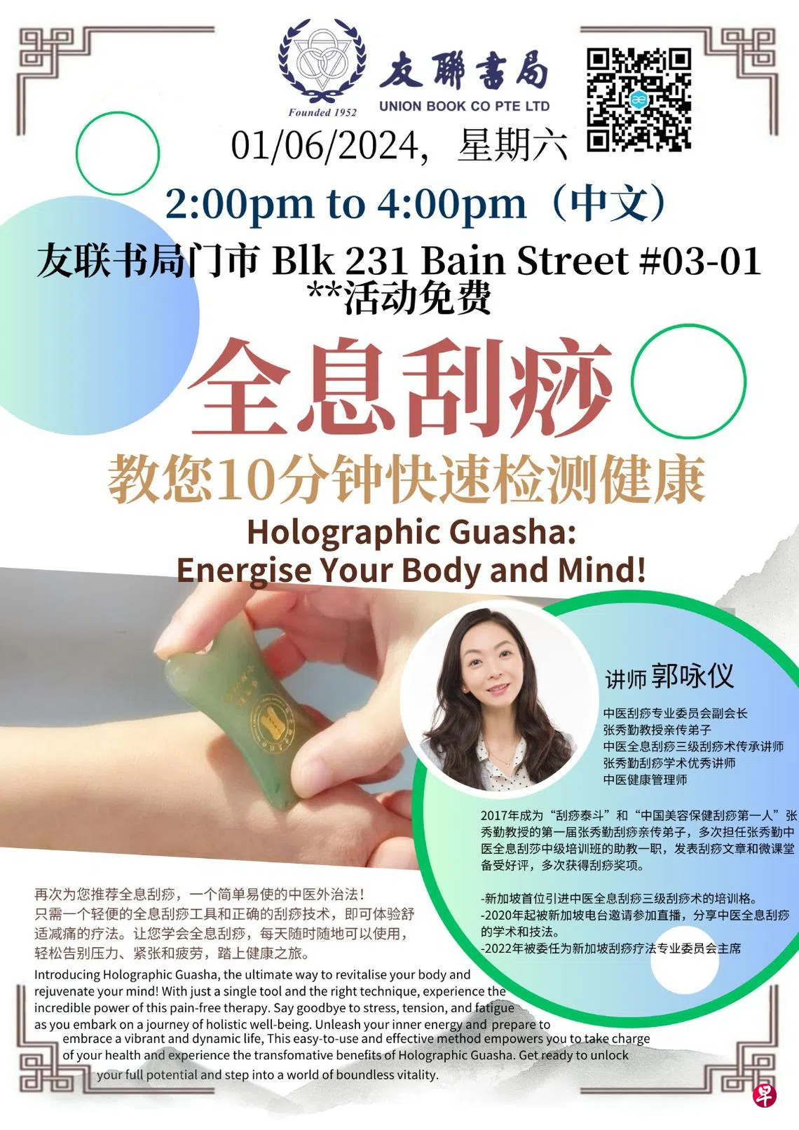 全息刮痧:教您10分钟快速检测健康郭咏仪:全息刮痧:教您10分钟快速检测健康 (友联书局)Date : 6/1/2024 SundayTime : 2pm-3.30pmLocation : Union Book Co Pte Ltd, #03-01 城市阅读节上一篇《你看见喜鹊了吗?》绘本亲子故事会 --《清明上河图》赏析下一篇新加坡书画购买此文章