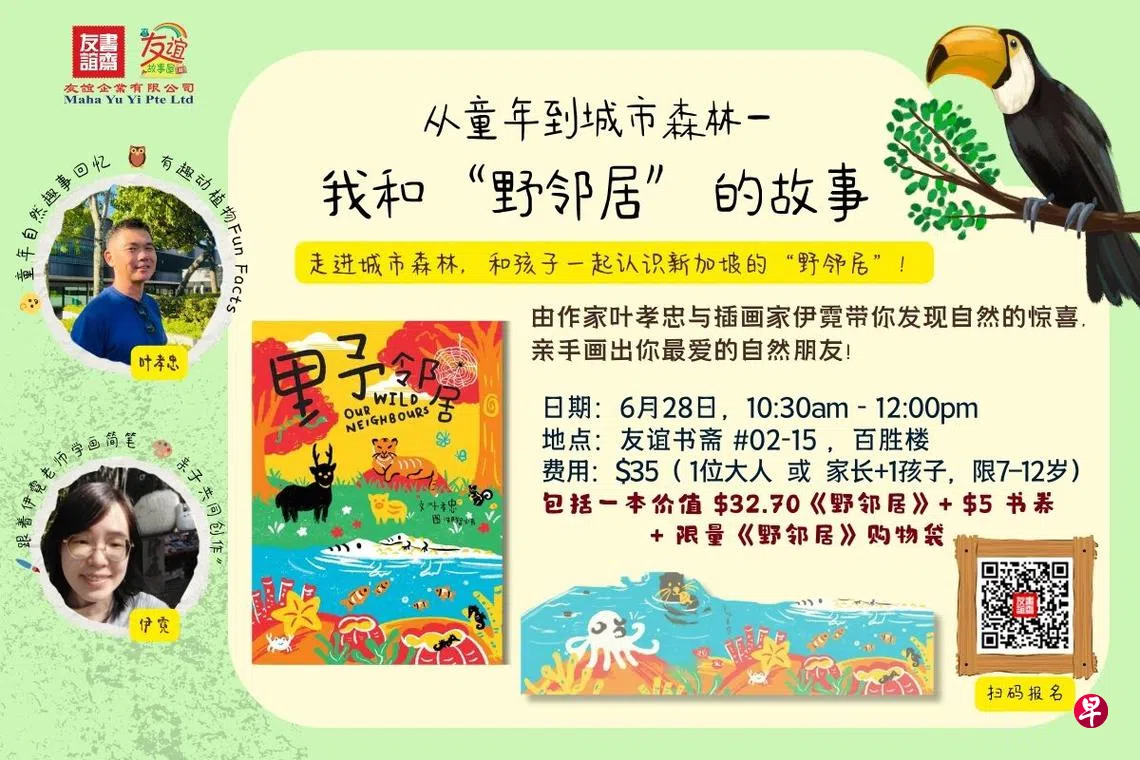 在这场活动中,作者叶孝忠将分享他与自然的童年回忆,以及书中“邻居”的有趣故事。插画家伊霓将带领大家动手画出你最喜爱的自然角色,不论是亲子同行,还是大人独自参与,都能在活动中收获对自然的新眼光。