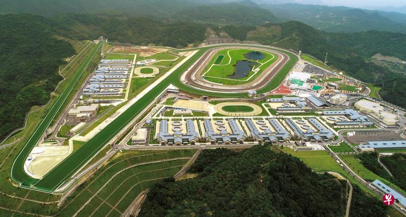 马场内拥有和香港马场几乎一致的三条跑道,供赛马训练;同时还新增了一条登山跑道,跑道全长1100米,并以1.54%的幅度持续上升,从化马场赛事营运及跑道经理黄泽信介绍,登山跑道对于培养参与长途竞赛的马匹,作用非常大,不少马匹回港后立刻交出好成绩。图为从化马场航拍全景图。(香港赛马会提供)