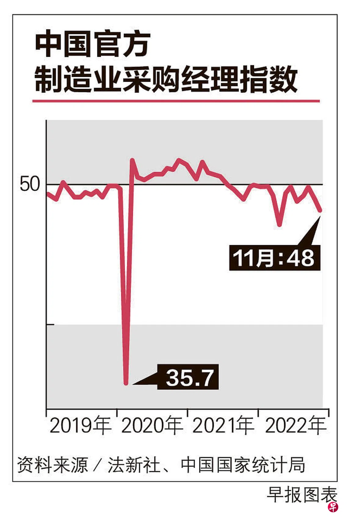 中国国家统计局星期三(11月30日)公布的数据显示,官方制造业采购经理指数(PMI)从10月的49.2降至11月的48,写下七个月来新低。这也是官方PMI连续第二个月低于50的荣枯线,陷入萎缩。