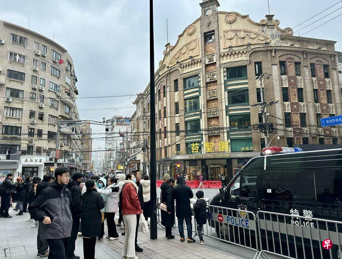 农历新年前夕,上海黄河路上人头攒动。在接近零度的寒风中,马路两侧的国际饭店西饼屋和杏花楼依然排起购买糕点的长队;路口的苔圣园酒家门前,更聚集不少拍照打卡的民众,警方不得不增派人手维持秩序。