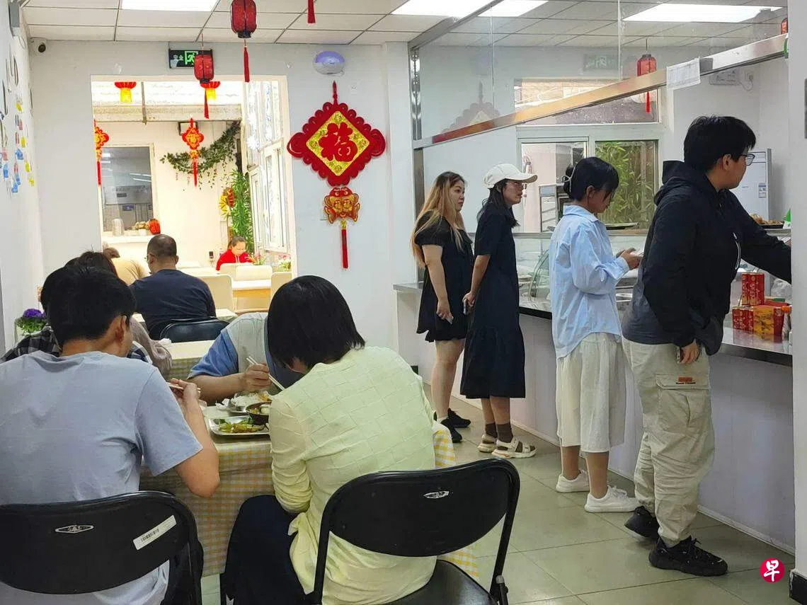 两三百平米的食堂很快挤满了前来吃饭的人群,8元(人民币,下同,约合1.50新元)一份炒油麦菜,15元一碗水煮鱼,18元一盘回锅肉,还有免费的西红柿蛋汤,近10种热气腾腾的菜品一列排开,年轻人和老年人一起排着队,高峰时段的队伍一直延伸到食堂入口处。