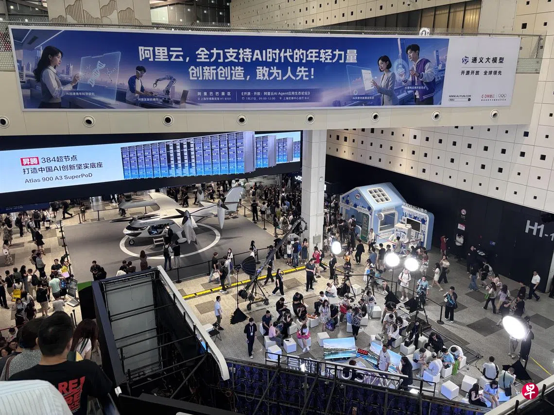 《联合早报》星期六在世界人工智能大会现场看到,今年具身智能展区尤其热闹,不同外观、功能的机器人竞相展示专长,吸引参展者驻足,宇树科技甚至在展区围起擂台,办起机器人拳击赛。