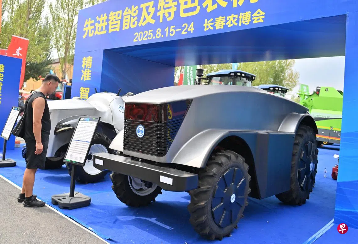 第24届中国长春国际农业·食品博览(交易)会(简称“长春农博会”)上星期五(8月15日)在长春农博园开幕,会期长达10天,以“科技农业、绿色农业、质量农业、品牌农业”为主题,向世界展示中国农业向智能、绿色、低碳加速转型的最新动态。智能农业机械展区是本届长春农博会的核心看点,超过200家中外企业带来氢燃料无人驾驶拖拉机、激光除草机、农业无人车等高科技农机。图为中国首台“5G+氢燃料”无人驾驶拖拉机,能在复杂地形完成自动驾驶或远程作业,并可根据负荷在氢能与“氢电混动”之间切换, 每亩作业成本仅需两元(人民币,0.36新元)。