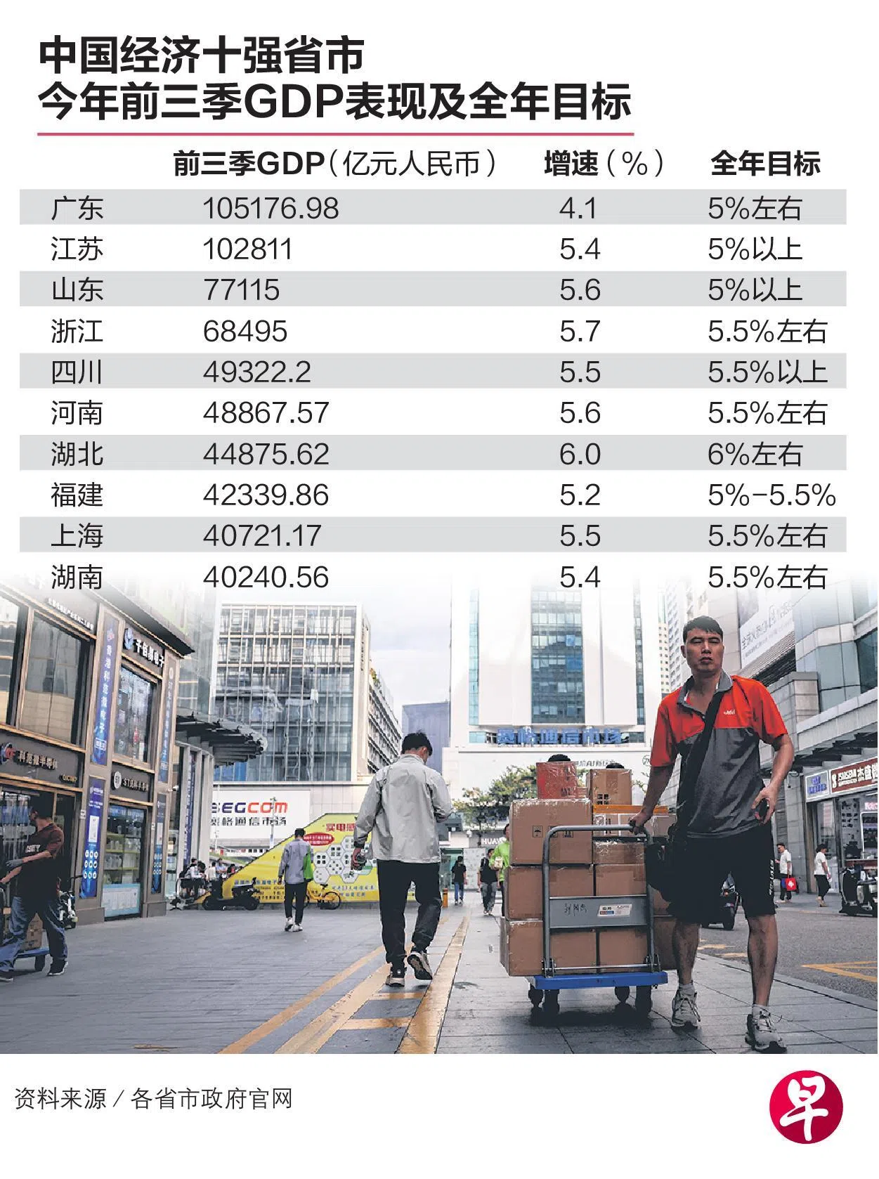 在经济体量上,广东和江苏依然稳居前二,前三季度GDP分别为10.5万亿元(人民币,下同,约1.9万亿新元)和10.3万亿元,皆超过10万亿元。