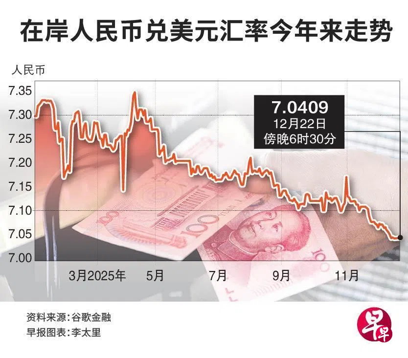 离岸、在岸人民币兑美元汇率星期一(12月22日)突破7.03和7.04关口,为去年10月以来新高,今年来升值4%和3.5%。