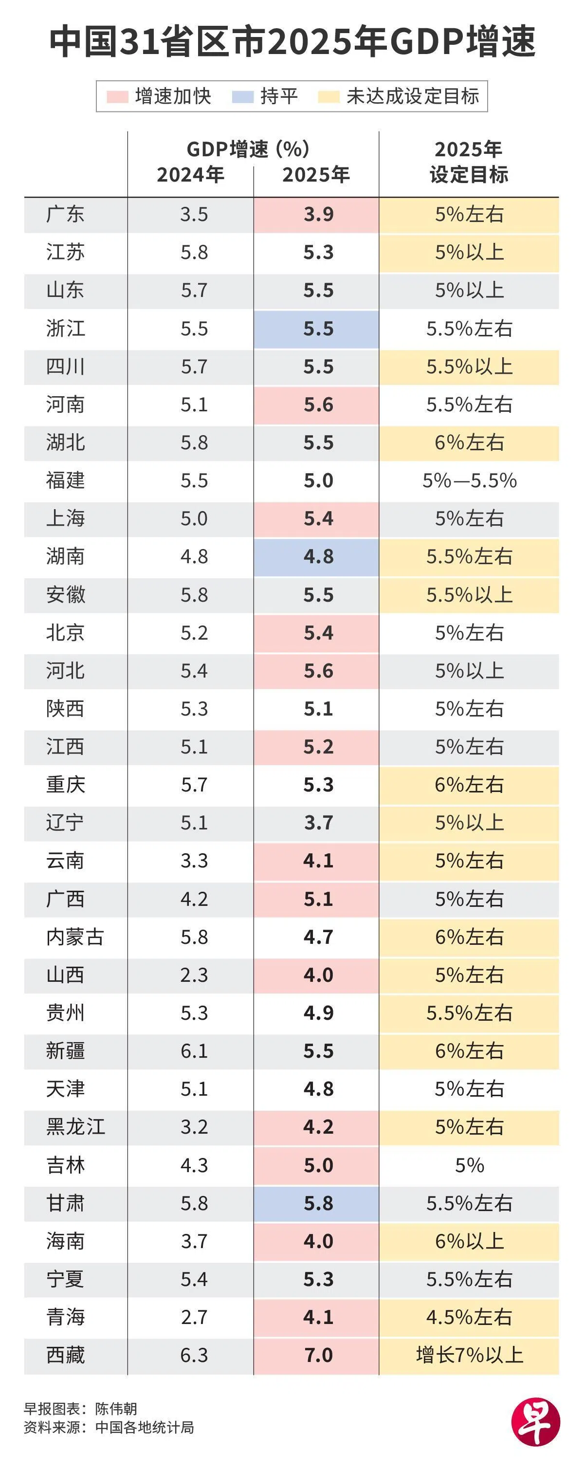 《联合早报》整理发现,共有17个省市区未达到2025年初设定的经济增长目标,较2024年的23个有所减少。