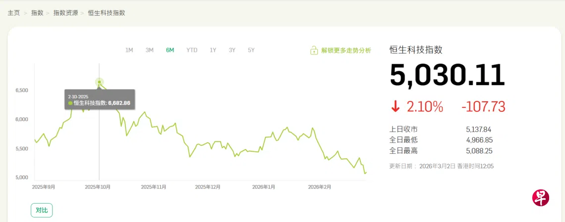 香港恒生科技指数跌破关键支撑线。在地缘政治紧张局势以及盈利前景持续承压的背景下,这一走势可能预示着进一步抛售。
