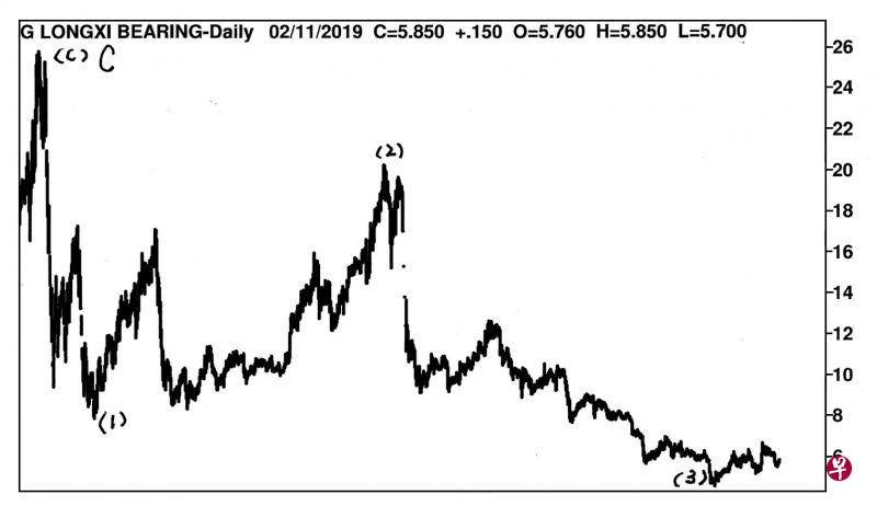 这只股票于2005年2月1日下跌至2.605元,过后于每月一杆图以“主要转向”信号止跌回升。2008年元月21日股价上升至12.395元,随即于每周一杆图以“主要转向”信号完成了A大波,接着回扯至同年11月5日的3.41元结束了B大波,旋进入具三波的C大波。2011年2月15日股价上升至15.93元完成了(a)波,过后回扯至2012年12月4日的5.31元结束了(b)波。2015年6月12日股价上升至25.85元,又于每月一杆以“转向”信号结束了(c)波,同时也为C大波画下句号,旋进入五波跌势。2015年9月16日股价下探7.92元完成了第(1)波;截至2018年10月19日股价已经下跌至4.58元,此为左图的第(3)波。短期回扯,股价当向上填补介于7.65元与7.72元,介于8.78元与8.85元,介于9.95元与9.96元及介于10.69元与10.70元的缺口,以完成第(4)波后,重返跌势。