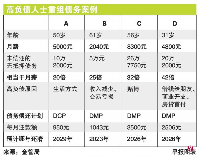 根据新加坡金融管理局提供的数据,截至今年2月,有5万8000人的无抵押债务超过12个月的薪水,他们的债务总额达52亿元,相当于每人欠债近9万元。