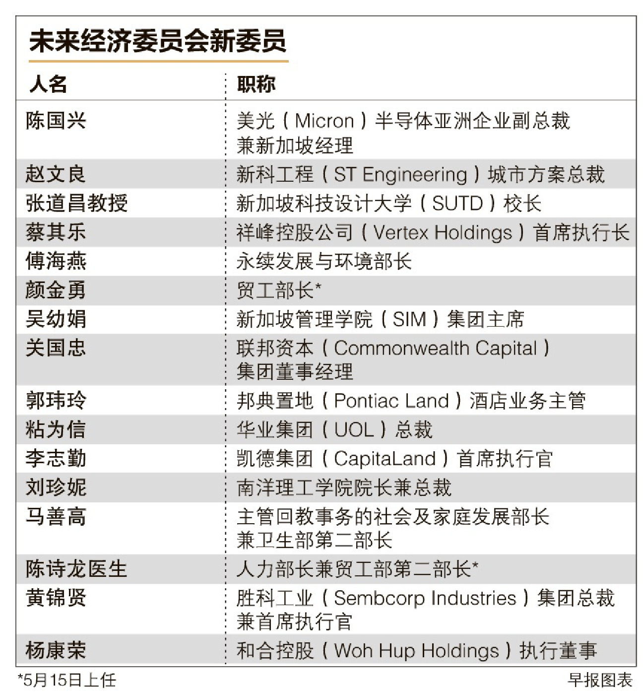新委员包括凯德集团(CapitaLand)首席执行官李志勤、南洋理工学院院长兼总裁刘珍妮以及多名部长,包括贸工部长颜金勇(5月15日上任,现为卫生部长)以及永续发展与环境部长傅海燕。