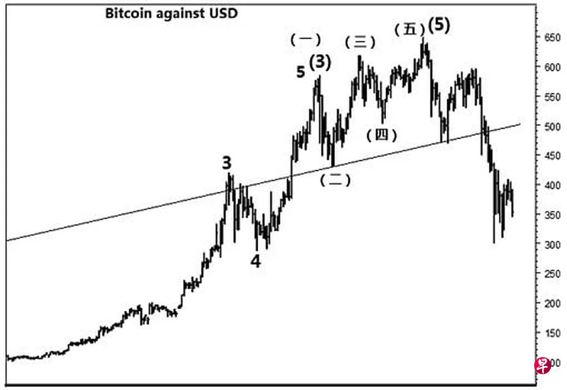 比特币自2015年1月14日下试152.40美元后,就进入五大波升势。2017年12月18日比特币上升至19458.19美元完成了第(1)大波;过后回扯至2018年12月15日的3122.67美元,此为第(2)大波,随后进入具五波的第(3)大波。2019年6月26日比特币上升至13895.10美元结束了第1波,接着回扯至2020年3月13日的3850.02美元完成了第2波。今年1月18日比特币升试41998.75美元结束了第3波,2月22日比特币上升至58445.23美元,并于当天以“主要转向”信号结束了第5波,同时为第(3)大波画下句号,遂以一个跌势“斜向交叉”走势替代了第(4)及第(5)大波。2月28日下调至43021.00美元为图中的第(二)点,而4月14日的64899.97美元为第(五)点,同时也为第(5)大波画下句号,旋以一个“头肩形”下跌。截至5月19日比特币已经下跌至30000.00美元,估计艰辛的回扯已经开始,且当试50131.67美元的“颈线”后,重返跌势。