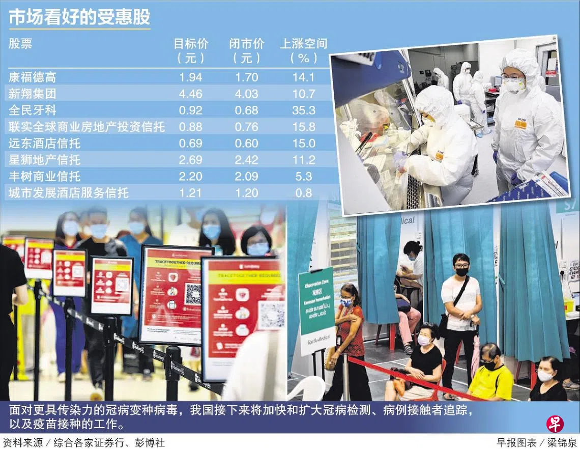 李总理前天下午向全民说明我国最新的三大防疫策略,将加快和扩大冠病检测、追踪病例接触者,以及接种疫苗,让新加坡更快走出疫情和开放边境管制。分析师预期,提供冠病检测的医疗业者、零售和酒店信托、餐饮,以及交通业者都将因此受惠。