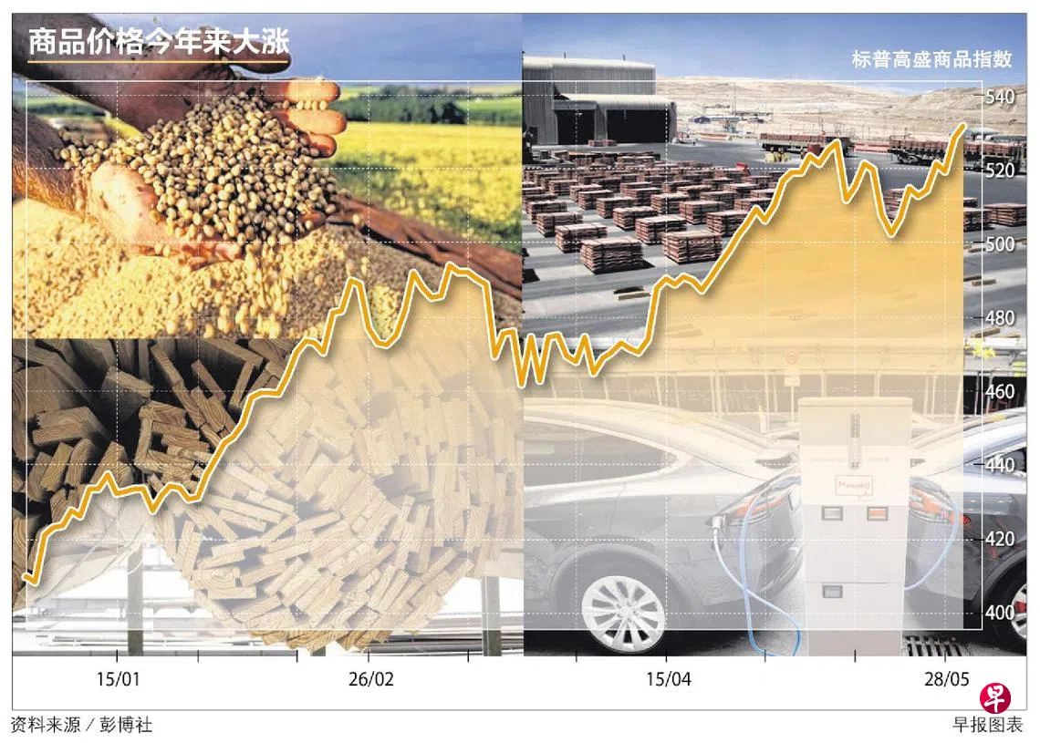 追踪24个交易所挂牌商品期货合约的标普高盛商品指数今年来攀升31%,其中铜价格上涨32%,一年涨幅达88%,今年最高价位也是2011年来的新高。在气候因素影响下,玉米和棉花等近期纷纷上涨。食油价格因供应担忧而跳涨,大豆油创下10年来最高。