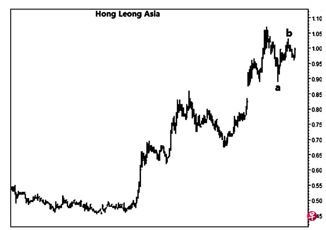 本栏于今年3月25日曾论及这只股票第(五)点回扯一旦结束,股价将迅速回升,且将填补介于0.745元与0.765元及介于1.06元与1.075元的缺口。何况若以其“斜向交叉”的基本目标将在1.10元之上。当时股价为0.745元左右。可是股价并没有立即回扯,而是继续上升。4月5日股价跳空上升至0.81元,不但填补了上述第一个缺口,同时也在介于0.78元与0.775元间留下缺口。4月7日股价再度跳空而上,直试0.92元,又在介于0.875元与0.825元间留下缺口。4月14日股价上升至0.965元后,随即进入调整。4月21日股价下探0.89元,且于当天以“主要转向”信号止跌回升。4月29日股价上升至1.07元,旋将上述第二个缺口的大部分填补。5月14日股价下试0.89元完成了左图中的a波,接着渐渐回扯。5月28日股价升试1.03元,且于当天以“转向”信号结束了b波,估计股价目前正处c波,当填补介于0.94元与0.935元及上述第四个缺口后,重返升势。